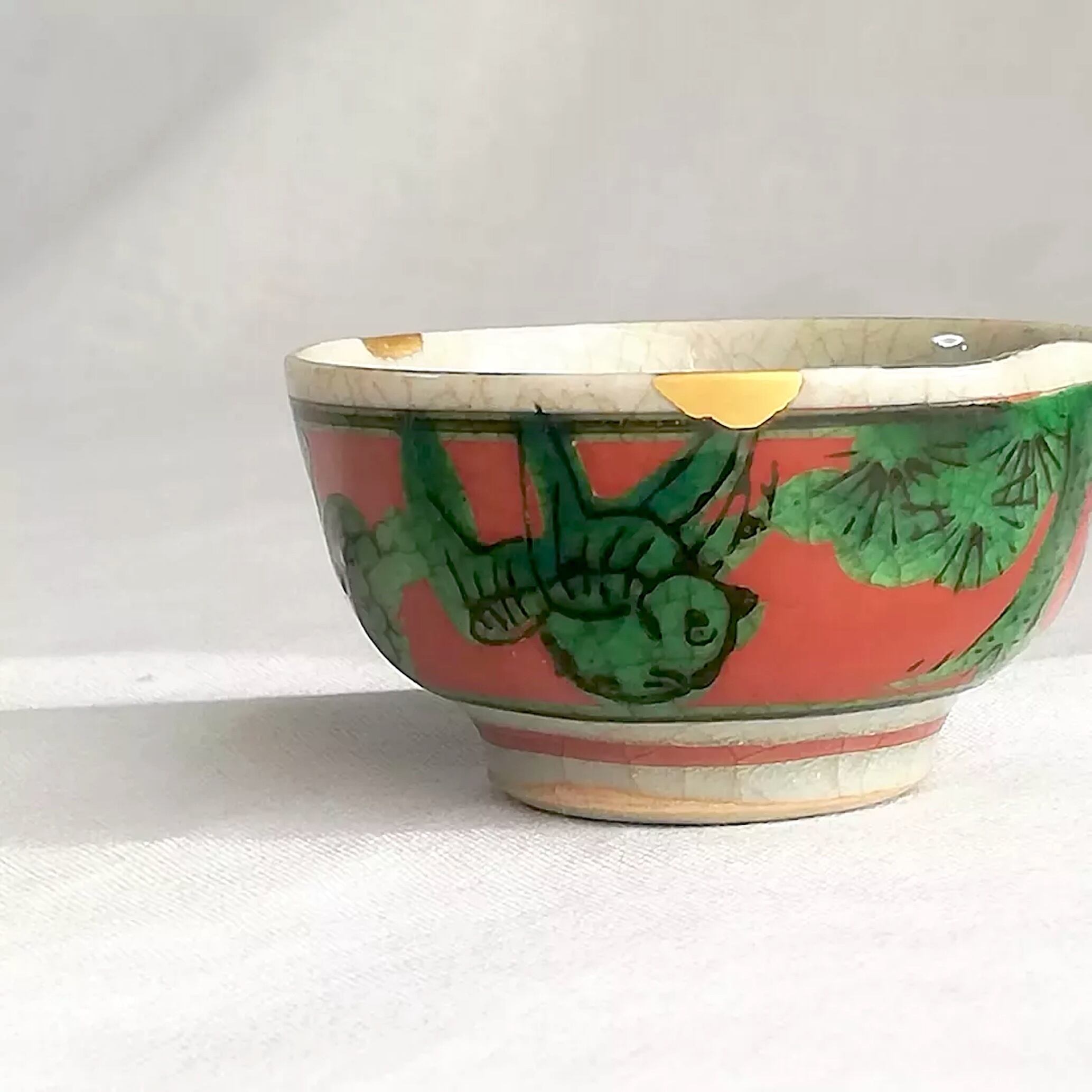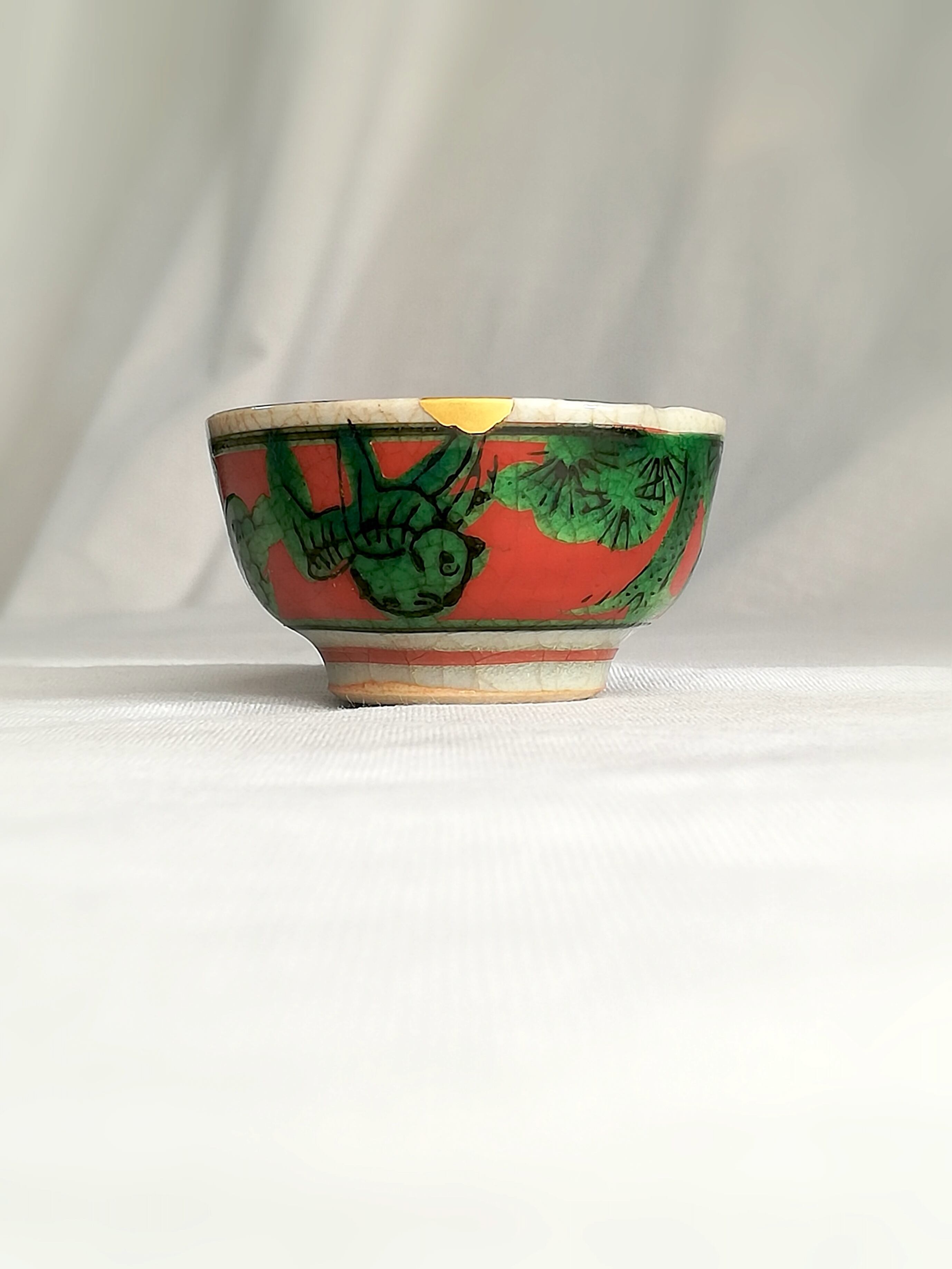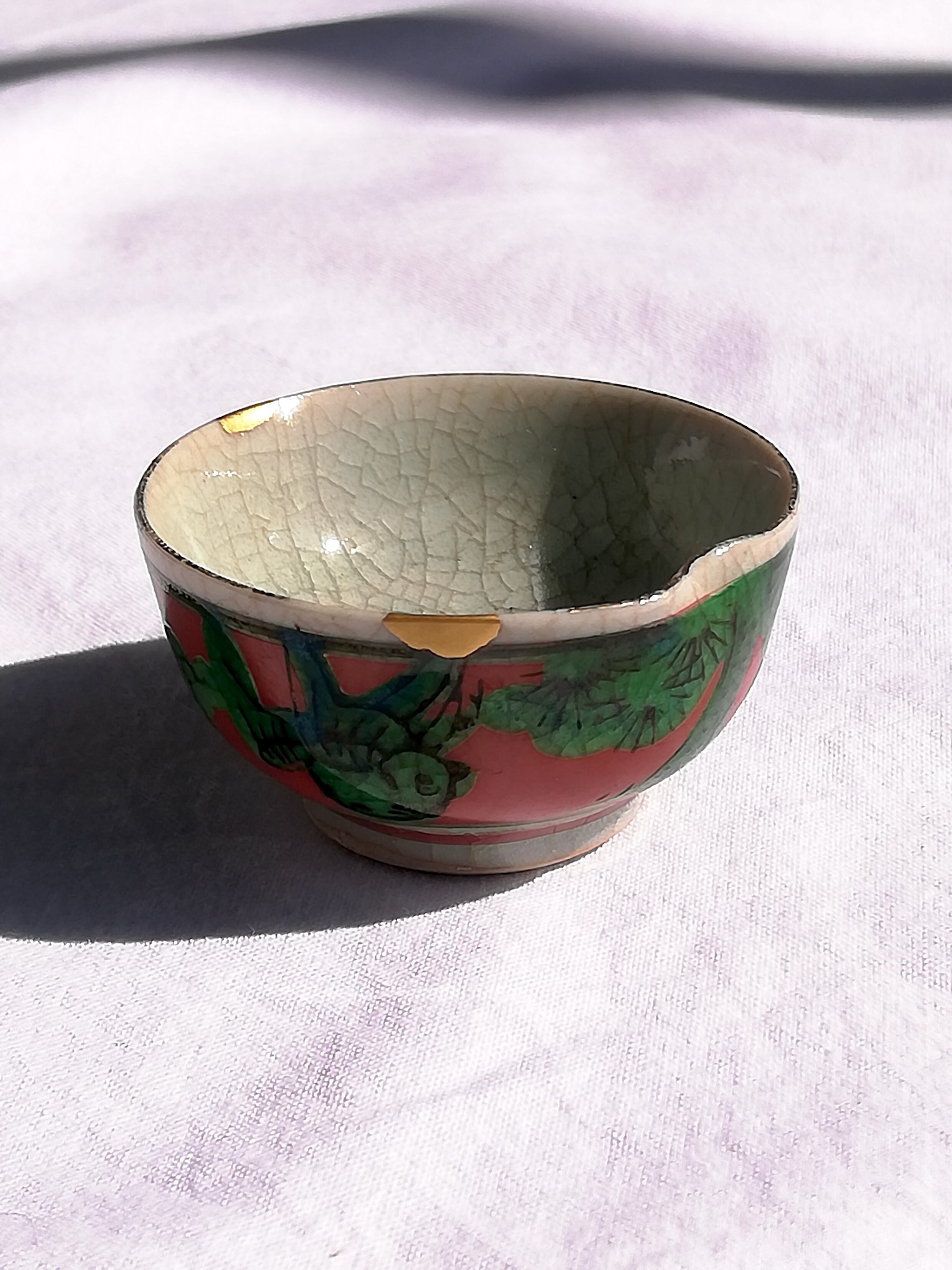 九谷焼のお猪口の欠け2ヶ所を金消粉で金継ぎしました。