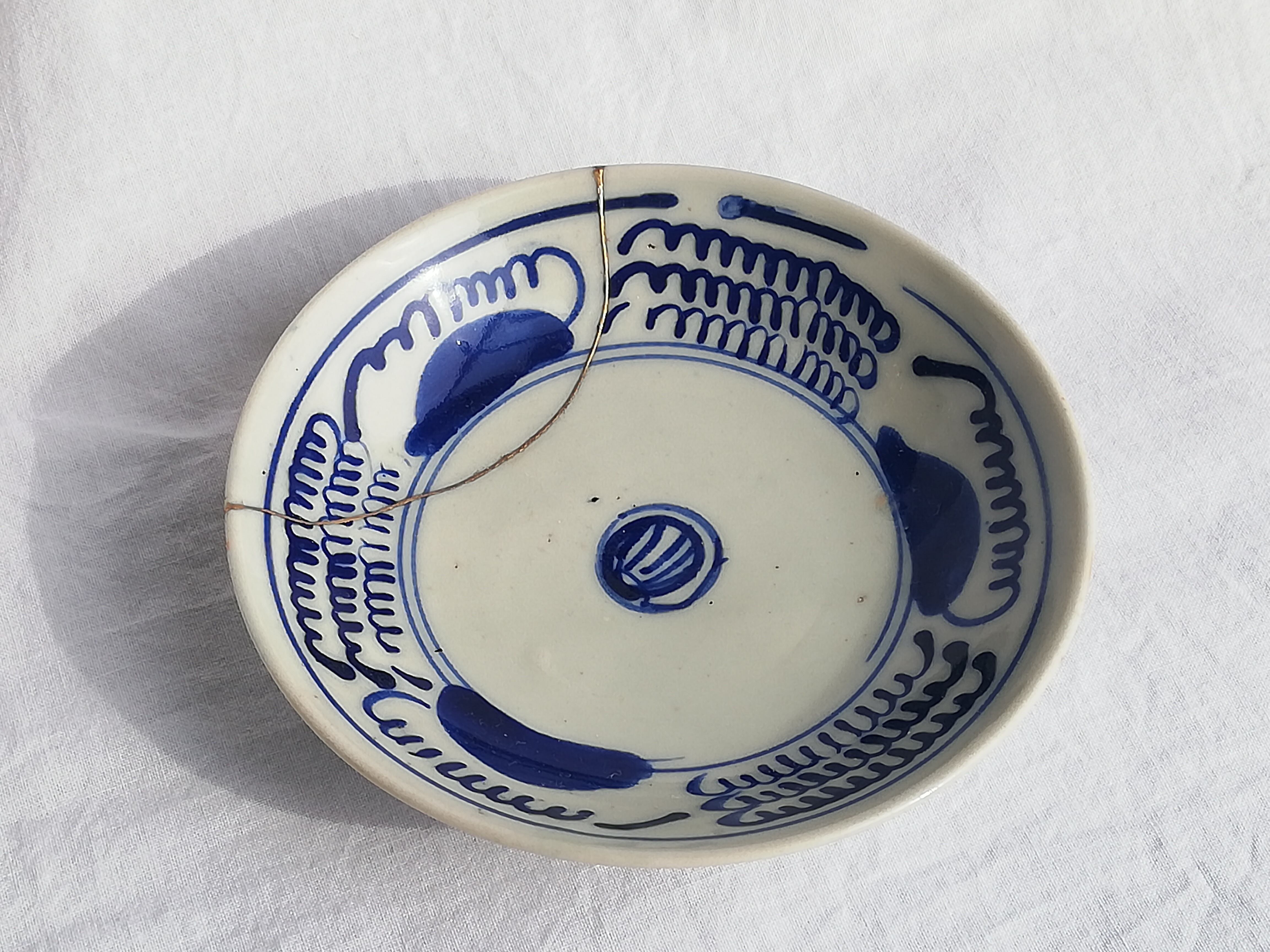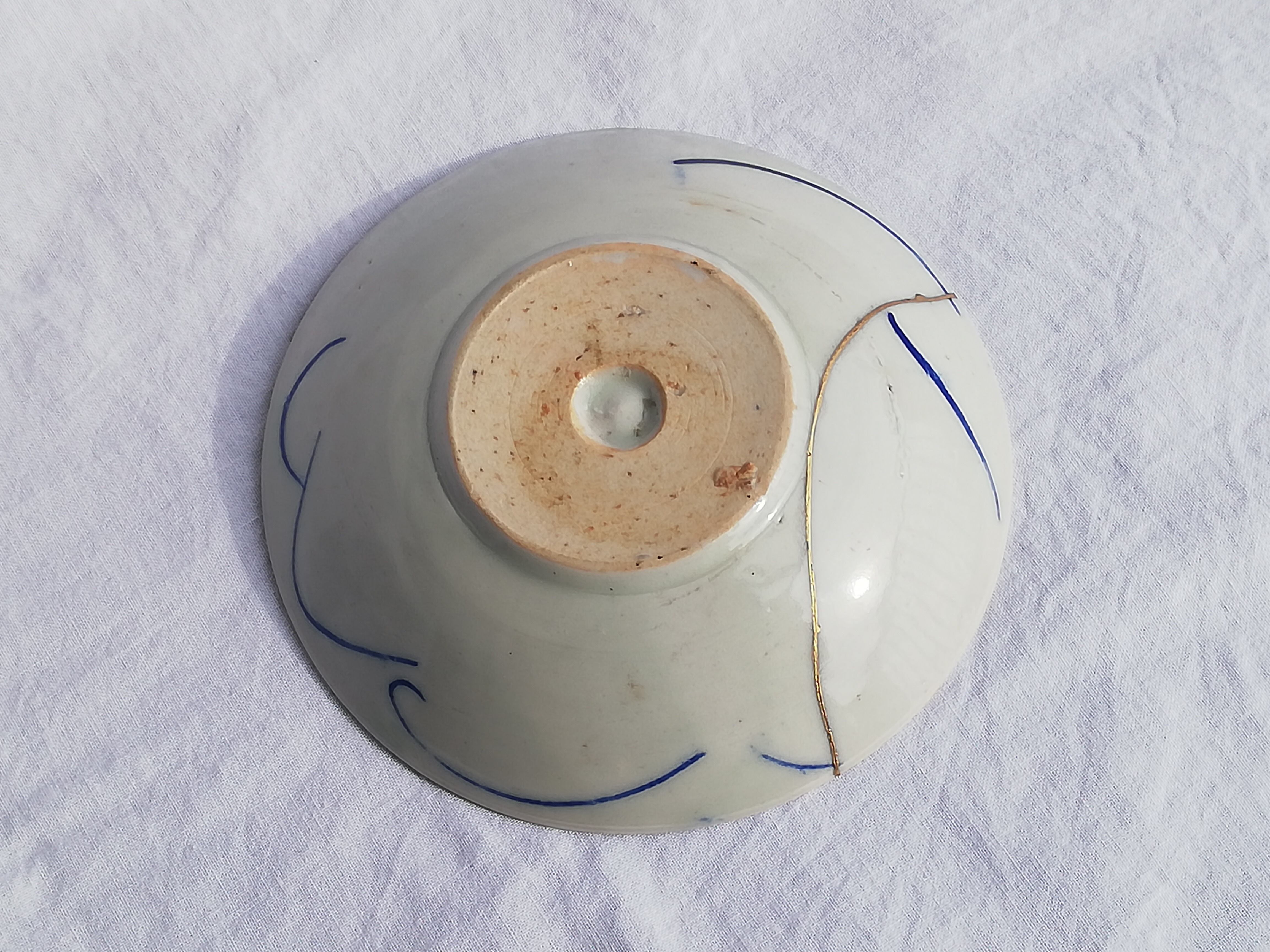 染付の骨董のお皿を洋金粉で金継ぎしました。