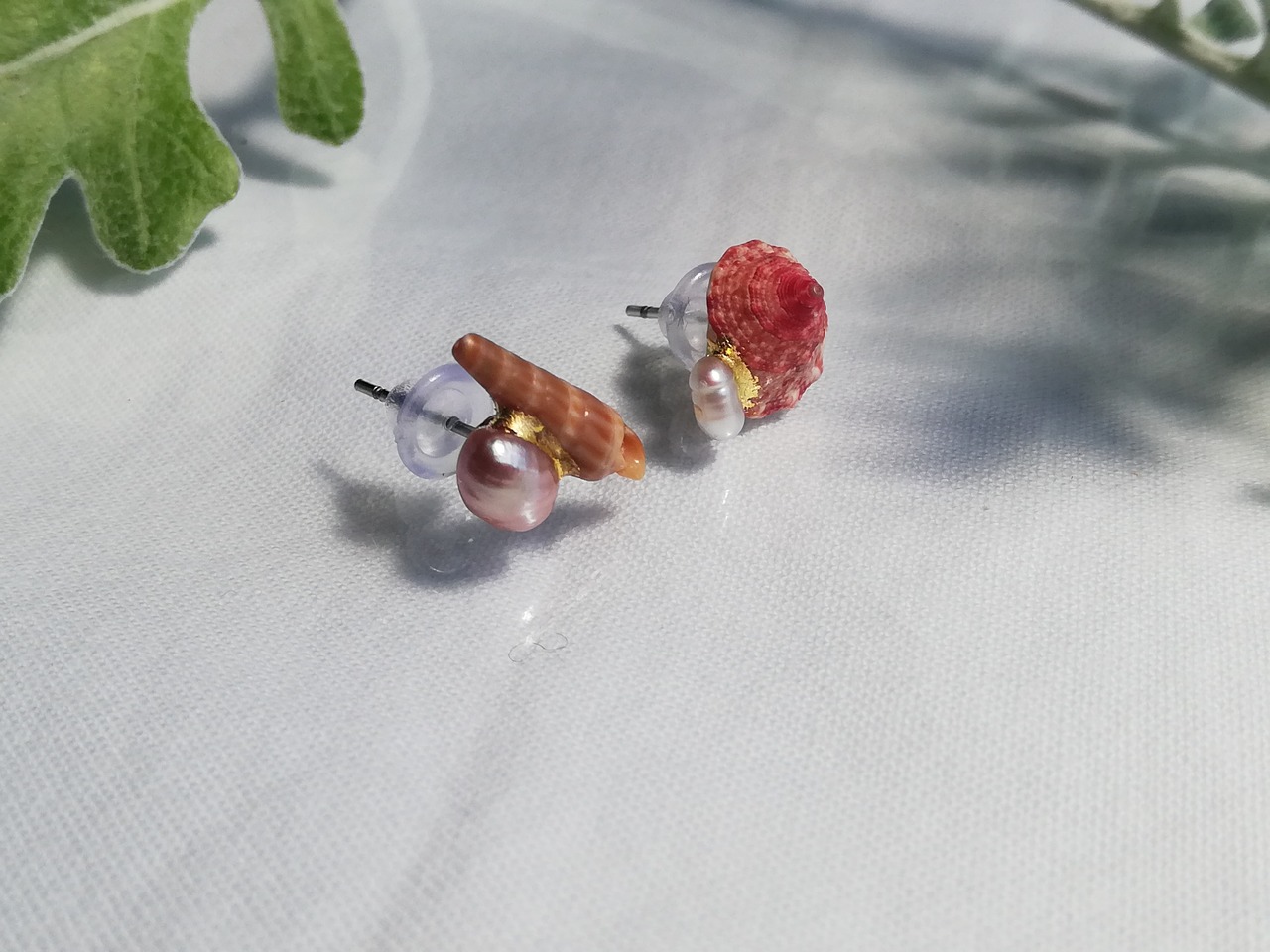 貝殻、パールをレジンと新うるしを使って金継ぎ(呼び継ぎ)したピアスです。