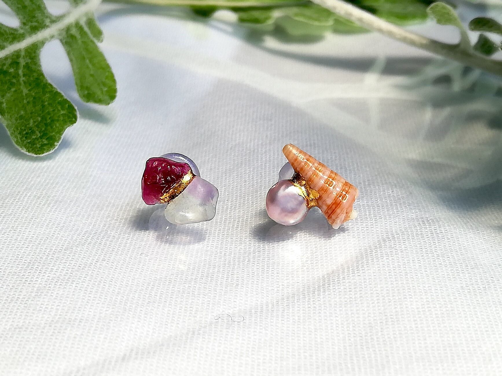 貝殻やパール、天然石をレジンと新うるしを使って金継ぎ(呼び継ぎ)したピアスです。