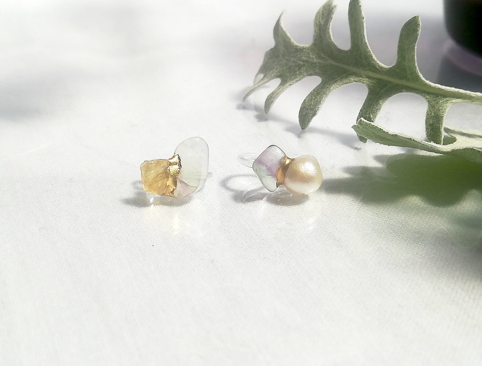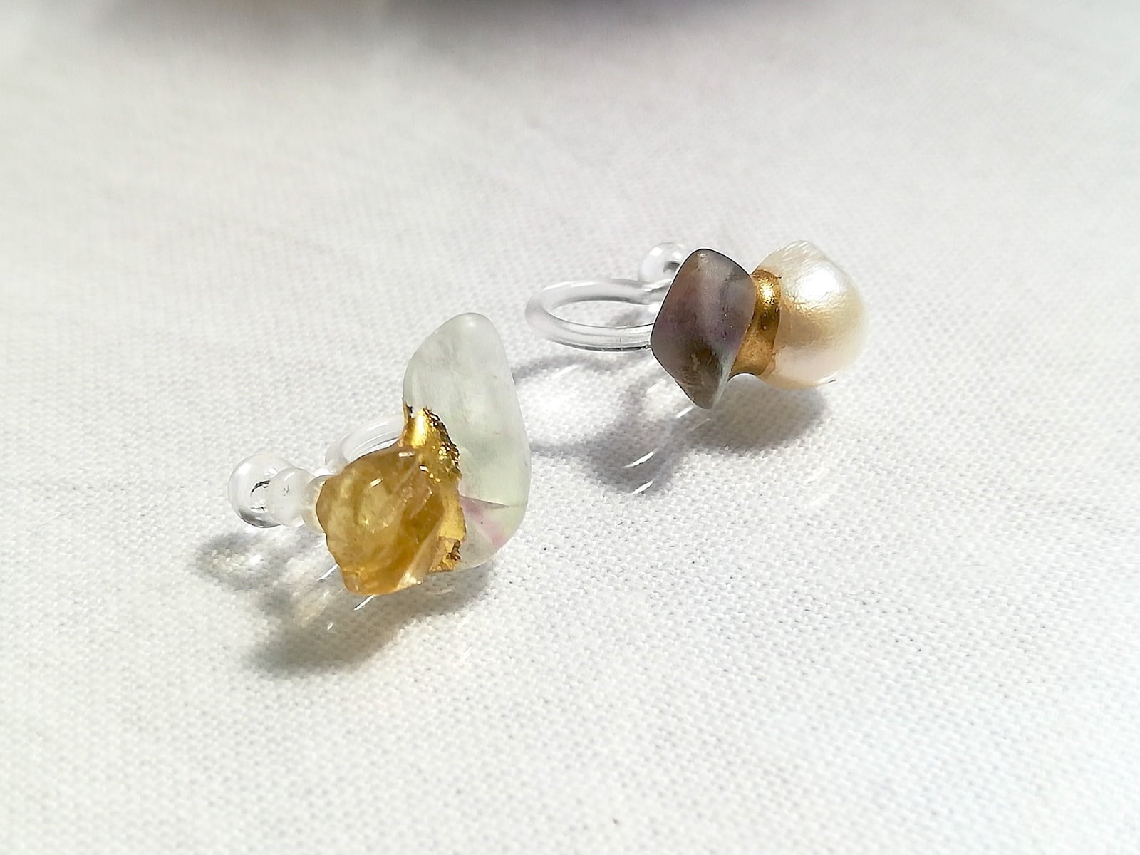 パール、天然石をレジンと新うるしを使って金継ぎ(呼び継ぎ)したイヤリングです。